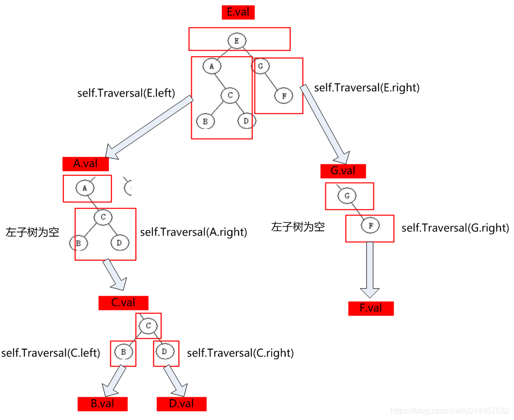 - 一开始指向根节点E,因为优先访问左子树,先看有没有左子树。发现根节点有左子树A,指向它
