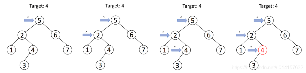 在这里实现的二叉搜索树的插入操作,主要思想是为目标节点找出合适的叶节点位置,然后将该节点作为叶节点插入。举例如下图所示: