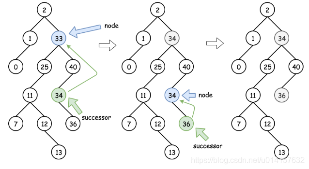 - case2:目标节点有右节点,则该节点可以由该节点的后继节点(successor,右子树最左边的节点)进行替代,该后继节点位于右子树中较低的位置。然后可以从后继节点的位置递归向下操作以删除后继节点。如下图所示: