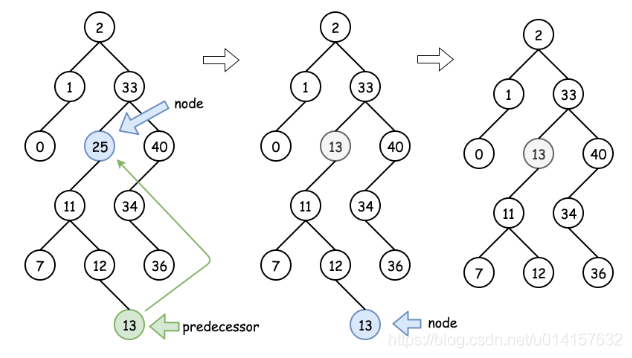 - case3:目标节点只有左节点,可以使用它的前驱节点(predecessor,左子树最右边的节点)进行替代,然后再递归的向下删除前驱节点。如下图所示: