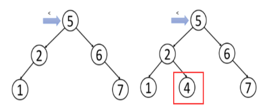 在左边这个树里插入4,从根节点开始,4小于5,因此继续搜索左子树。4大于2,而且2没有右孩子,因此4作为2的右孩子插入到树中。此题对于leetcode的第701题。
