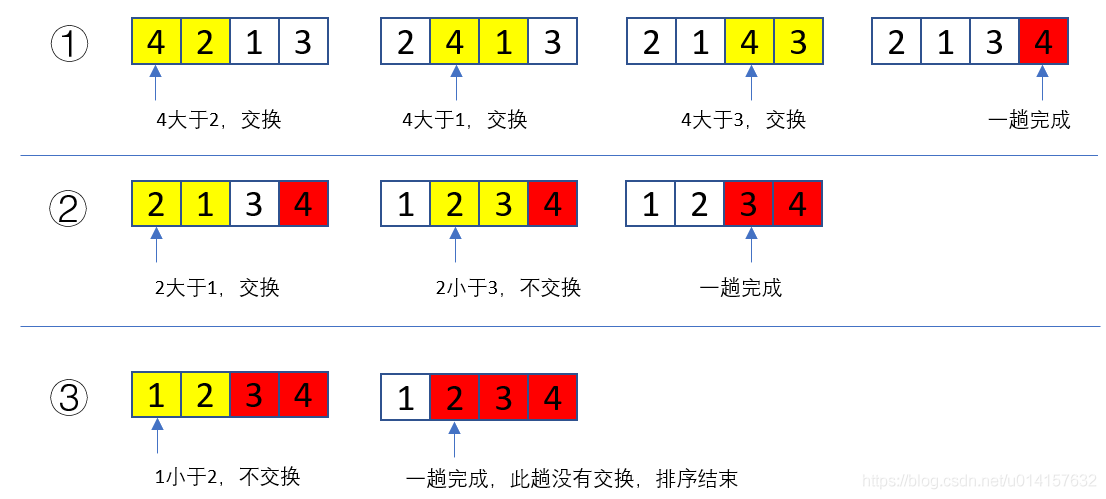 - 列表每两个相邻的数,如果前者大于后者,则交换这两个数;遍历列表,完成一趟排序