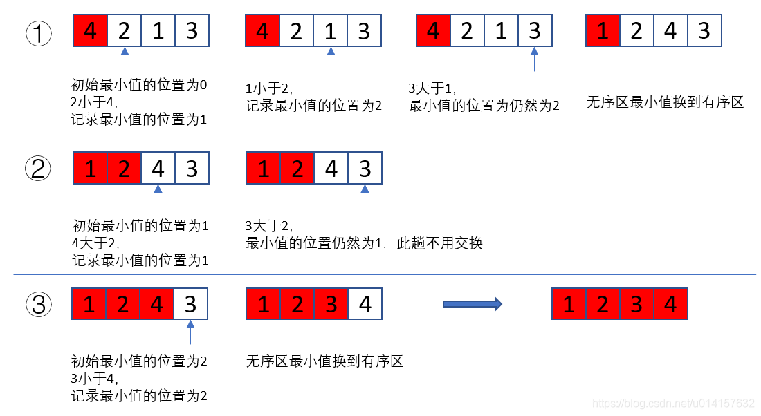 - 再遍历一趟,记录无需去最小的数,放到有序区的第二个位置