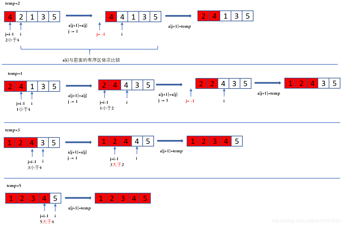 while j >= 0 and temp < a[j]: # 遍历有序区