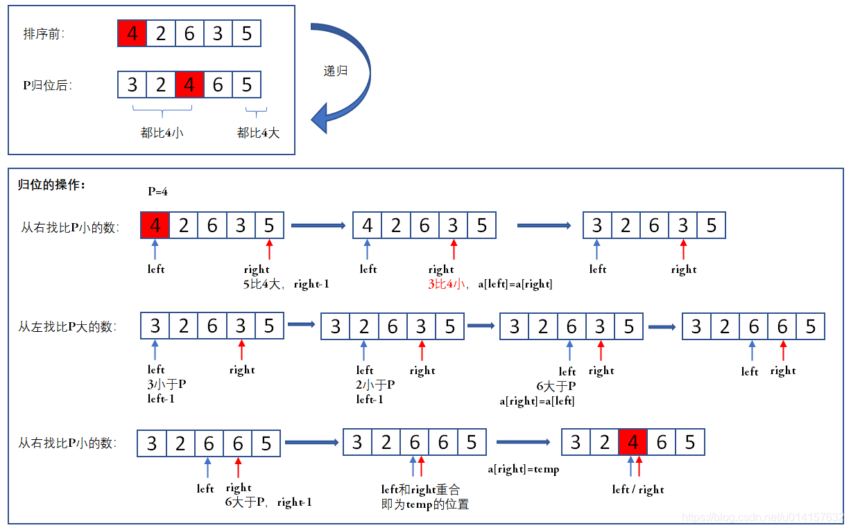 - 取一个元素(一般为第一个元素)P,使元素归位