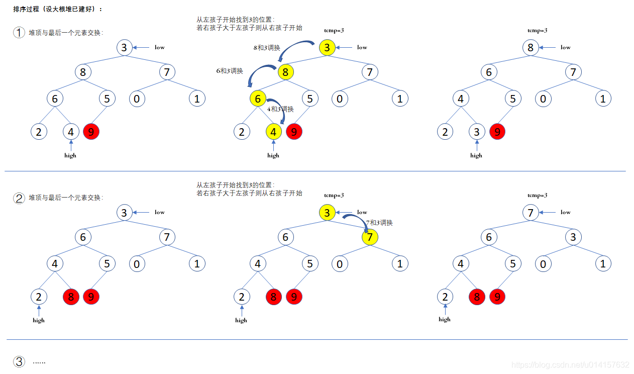 - 步骤3:堆顶元素和堆的最后一个元素交换,交换后可以通过一次调整使堆有序(不包括刚才及之前被换到堆后面的元素)