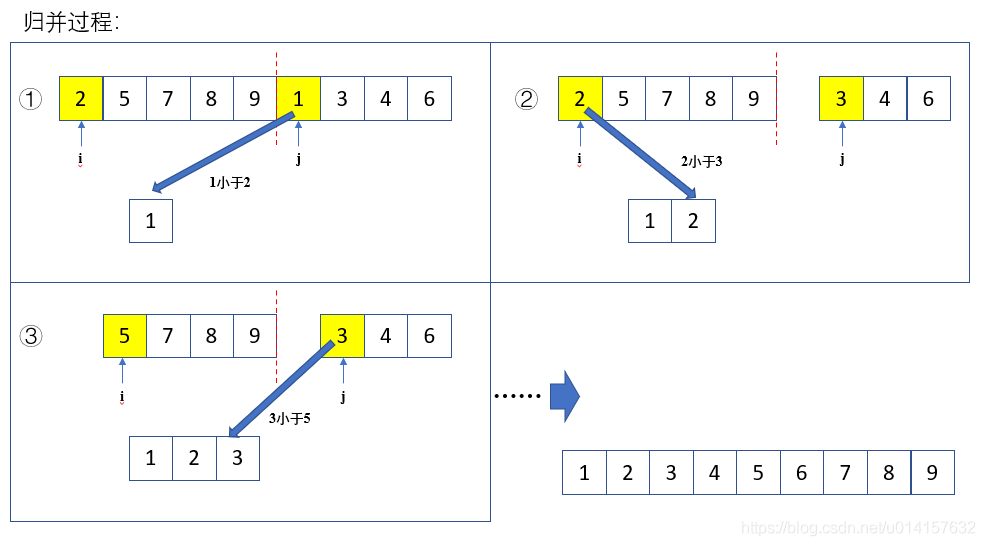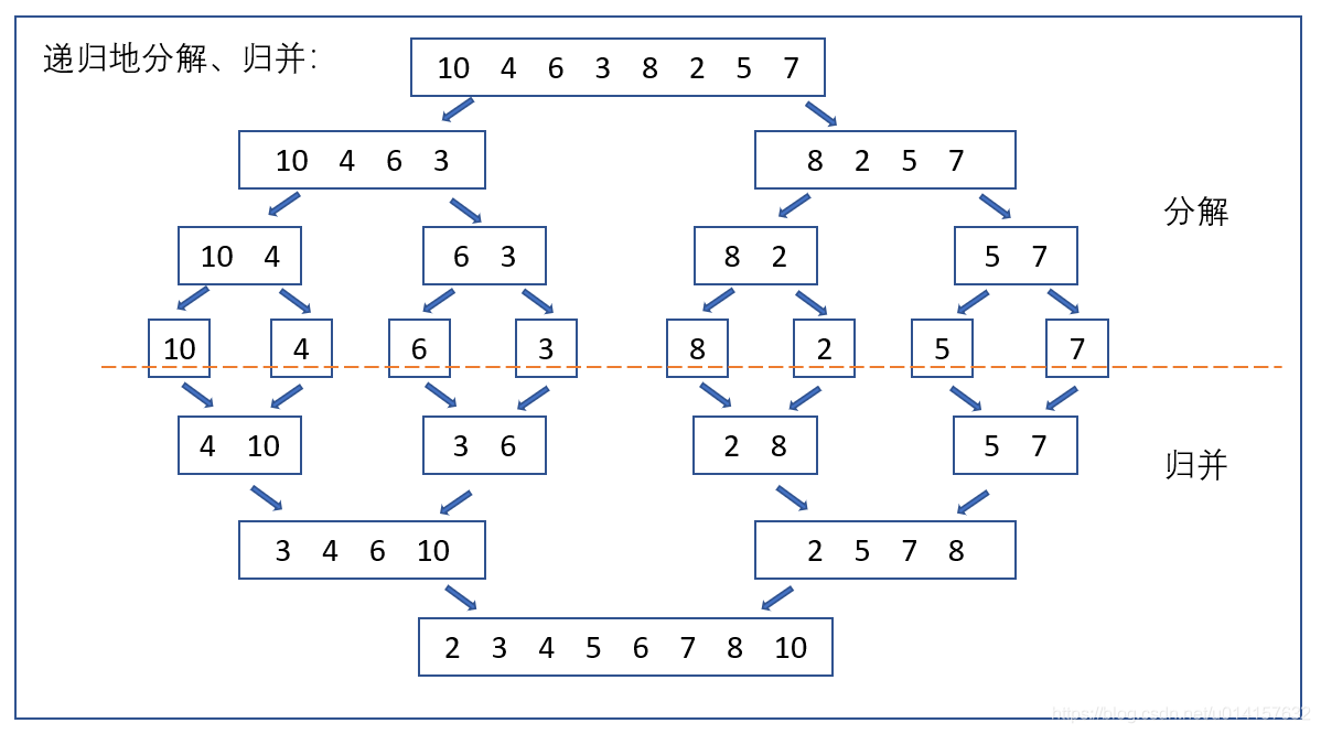 | 归并排序 | $O(n \log n)$ | $O(n \log n)$ | $O(n \log n)$ | $O(n)$ | out-place | 稳定 |