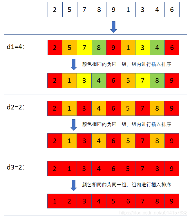 - 去第二个整数$d_2=d_1 // 2$,重复上述分组排序过程,直到$d_i=1$,即所有元素都在同一组内插入排序
