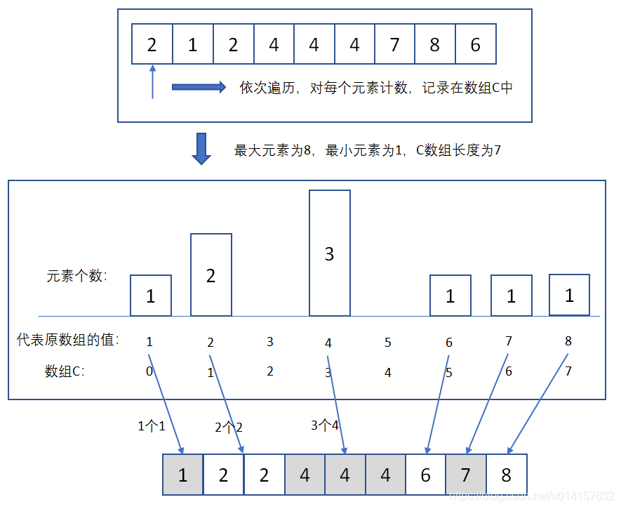 - 步骤4:填充目标列表:将每个元素$i$放在新列表的第$C(i)$项,每放一个元素就将$C(i)$减去1。