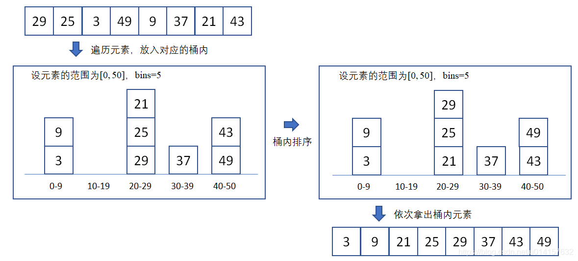 - 步骤4:从不是空的桶里把排好序的数据拼接起来。