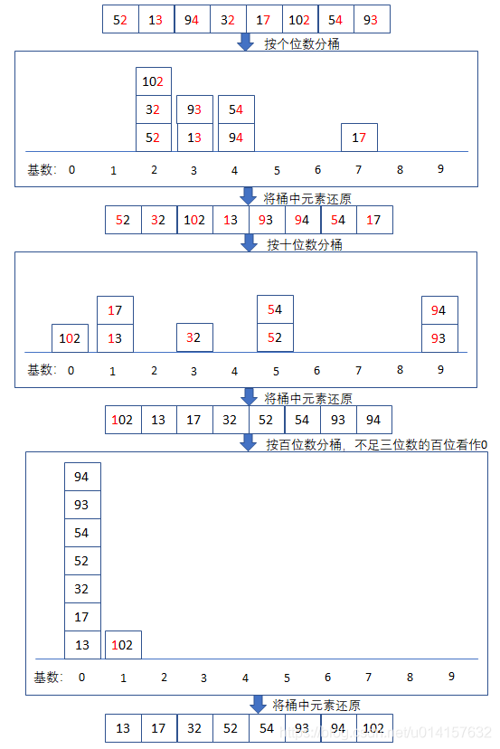 - 步骤4:重复上述分桶、还原的过程,直到最大元素的最高位