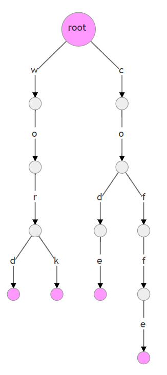 比如有一个包含多个单词的列表:[‘word’, ‘work’, ‘code’, ‘coffe’],可以下面的字典树表示:
