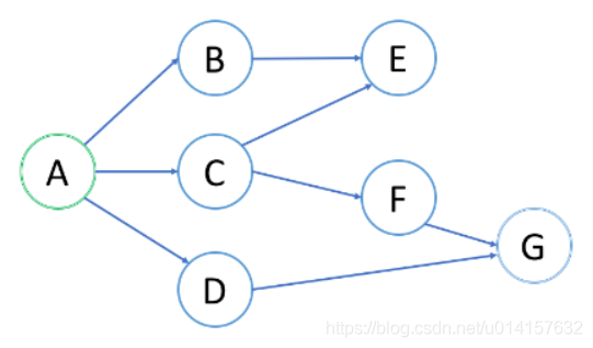 广度优先搜索(BFS,Breadth First Search) 的一个常见应用是找出从根结点到目标结点的最短路径,其实现用到了队列。下面用一个例子来说明BFS的原理,在下图中,我们BFS 来找出根结点 A 和目标结点 G 之间的最短路径。